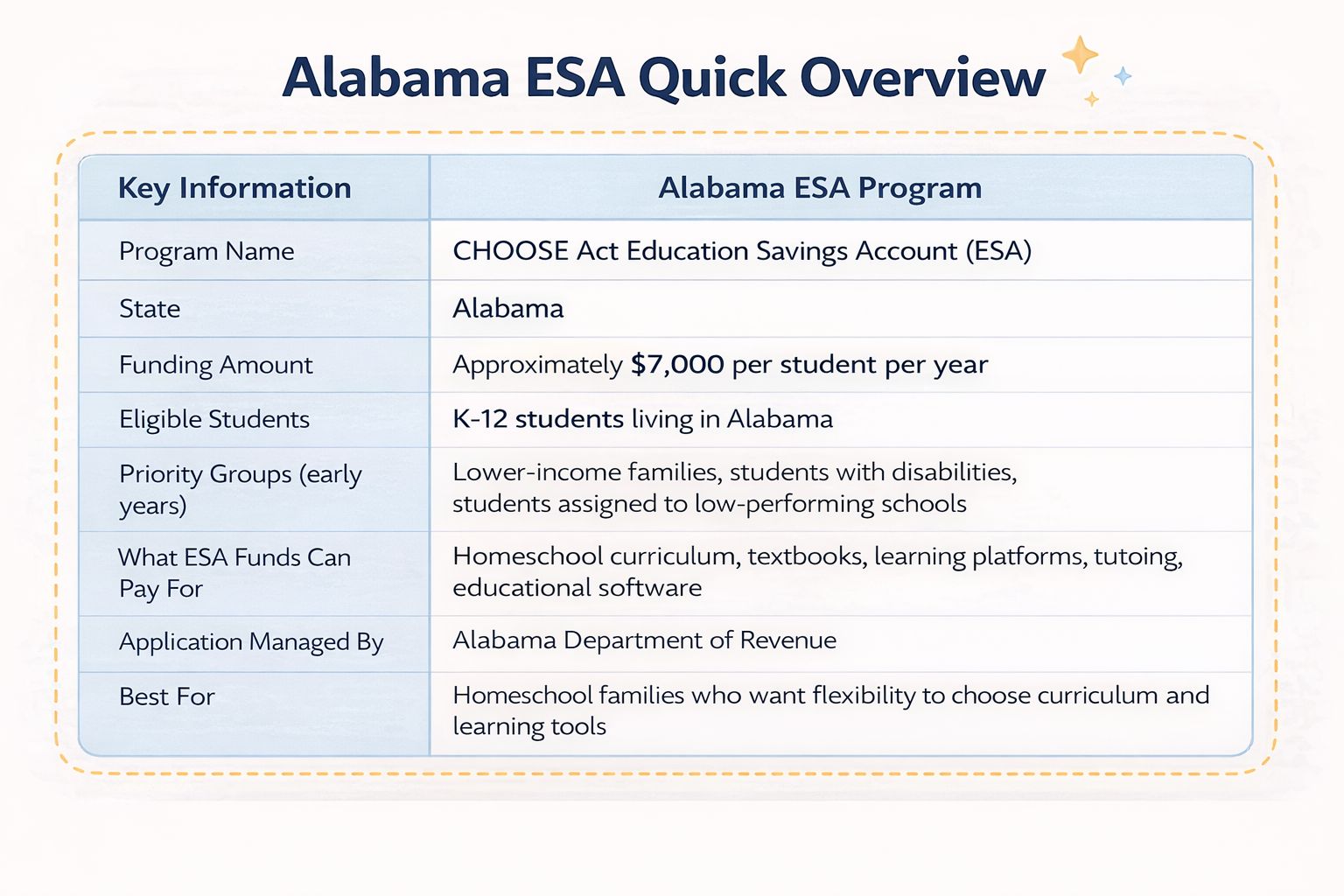 Alabama’s CHOOSE Act ESA program allows eligible families to receive education funding from the state and use it for approved educational expenses.